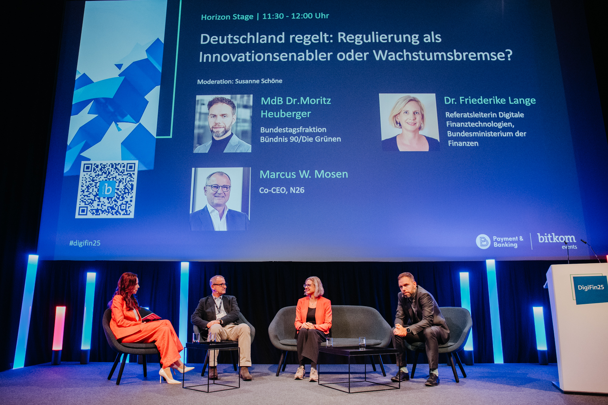 Im nächsten Panel geht es um die Frage, wie Regulierung zur Weiterentwicklung des Finanzstandorts beitragen kann – und wo sie Herausforderungen schafft. Darüber sprechen Moritz Heuberger, Mitglied der Bundestagsfraktion Bündnis 90/Die Grünen, Frederike Lange, Referatsleiterin für Digitale Finanztechnologien im Bundesministerium der Finanzen, sowie Marcus W. Mosen, Co-CEO von N26.