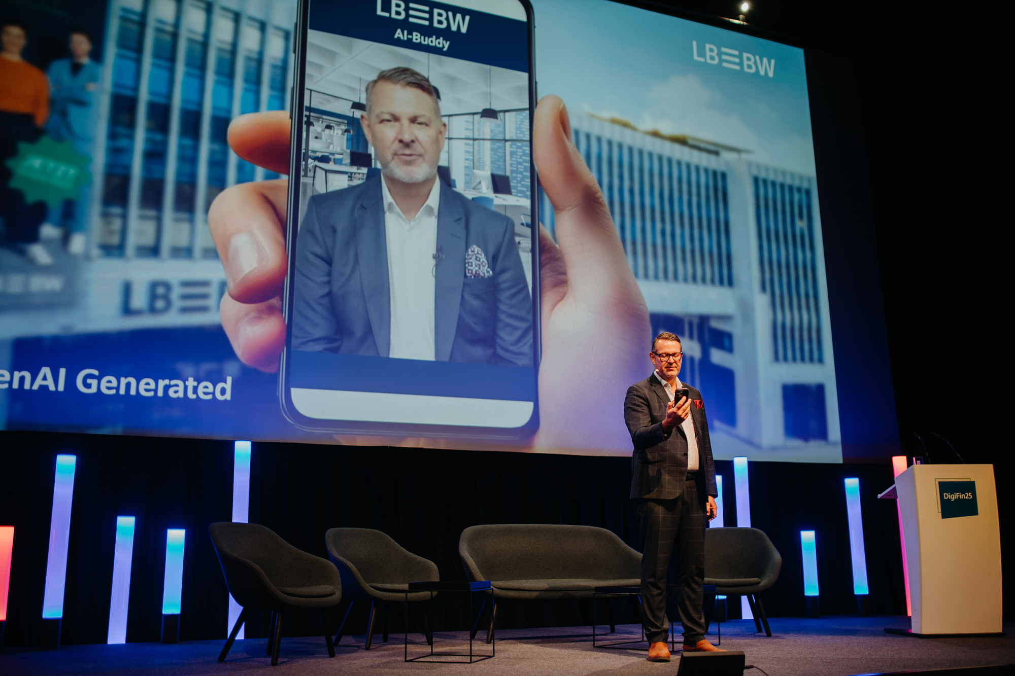 KI kann nicht nur zur Betrugsprävention beitragen, sondern eröffnet auch neue Möglichkeiten für Finanzdienstleistungen. Welche Potenziale er sieht, erläutert Stephen A. Paxmann, Chief Innovation Officer der LBBW. Er geht davon aus, dass künftig individuelle KI-basierte Assistenten Kundinnen und Kunden bei Geldanlage und Vermögensverwaltung unterstützen werden. Zur Veranschaulichung zeigt Paxmann auf der Bühne eine kurze Demonstration, in der er mit einem digitalen LBBW-KI-Berater interagiert.